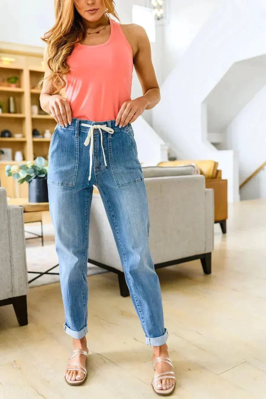 Los Pantalones de Mezclilla Melissa™ Estilo Jogger son mucho más que unos simples joggers vaqueros. Con su increíble elasticidad, cintura elástica, dobladillo interior flexible y bolsillos profundos, ofrecen una experiencia de uso inigualable.