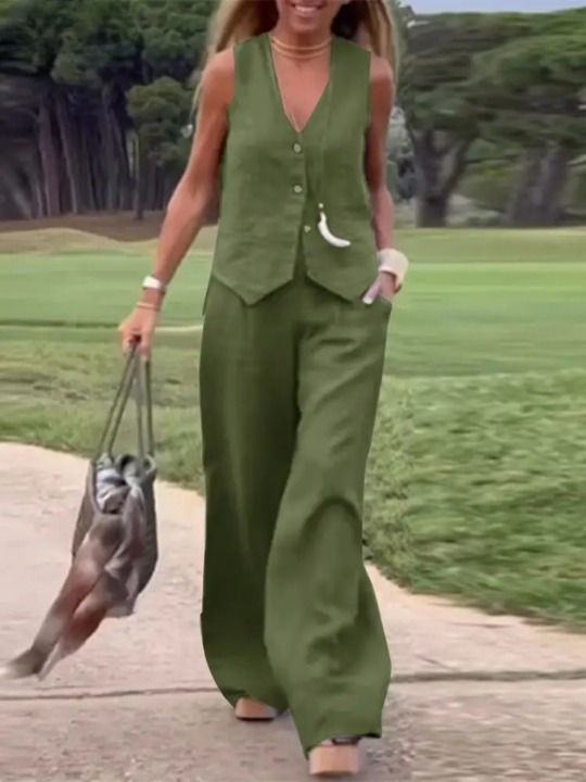 Este conjunto de dos piezas con chaleco sin mangas y pantalón ancho rezuma clase y comodidad. Perfecto para los días soleados en los que quieres lucir elegante y relajado.