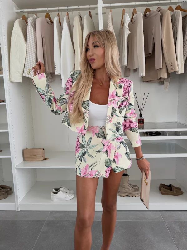 Conjunto con estampado floral compuesto por chaqueta corta y pantalón.