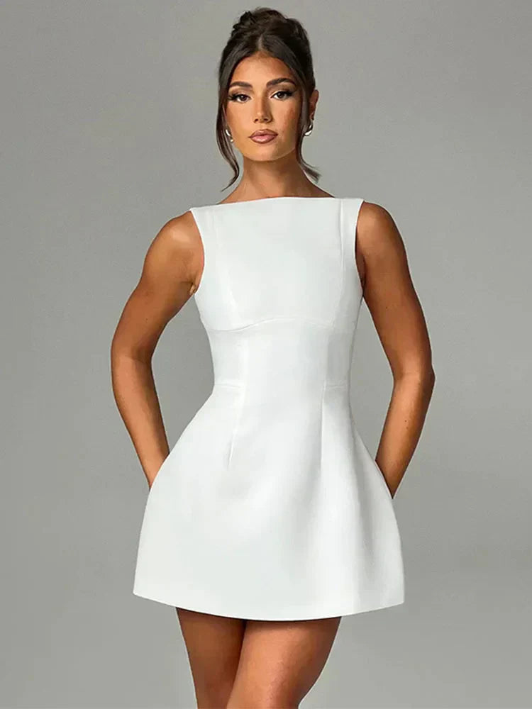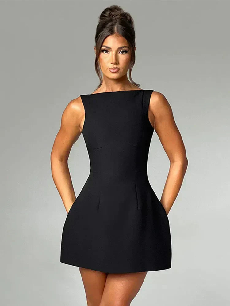 Descubre la sofisticación del Vestido Virginia™, un elegante minivestido que presenta un corte en A y una seductora espalda descubierta. Sin mangas y ajustado al cuerpo, este vestido es la definición misma de estilo y elegancia.